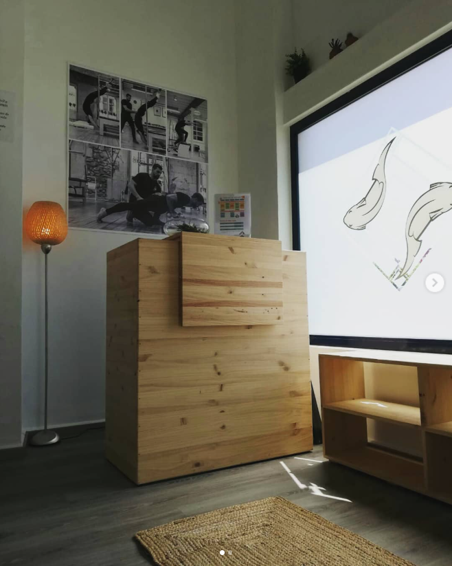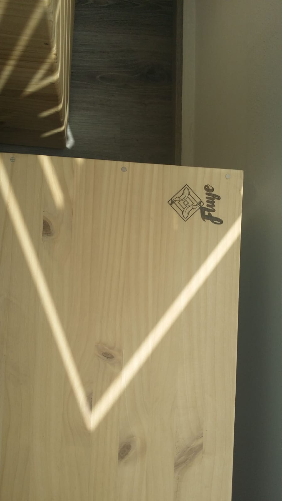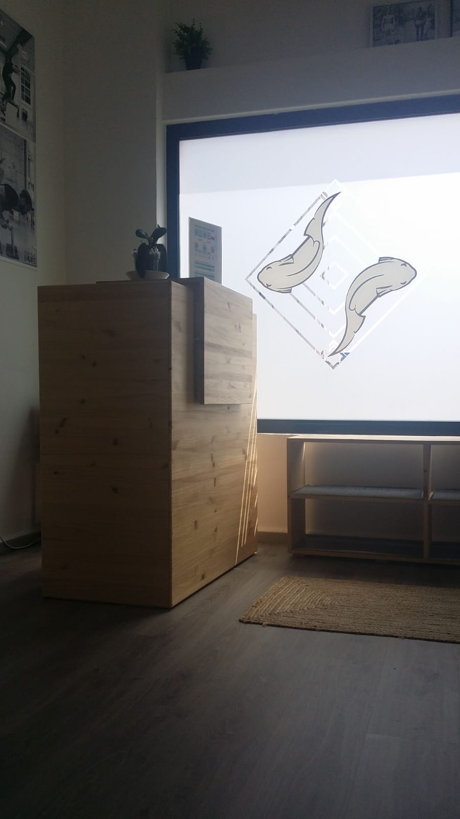 Complementando el conjunto, diseñamos una estantería baja que cumple una doble función: permite sentarse cómodamente para descalzarse y al mismo tiempo ofrece espacio para mantener los zapatos ordenados al entrar al centro. Cada uno de los muebles fue personalizado con el logotipo de Fluye, grabado con precisión mediante láser, aportando un detalle distintivo que refuerza la identidad del espacio. El resultado es un mobiliario que no solo responde a las necesidades prácticas del centro, sino que también transmite armonía, estilo y personalidad desde el primer momento.