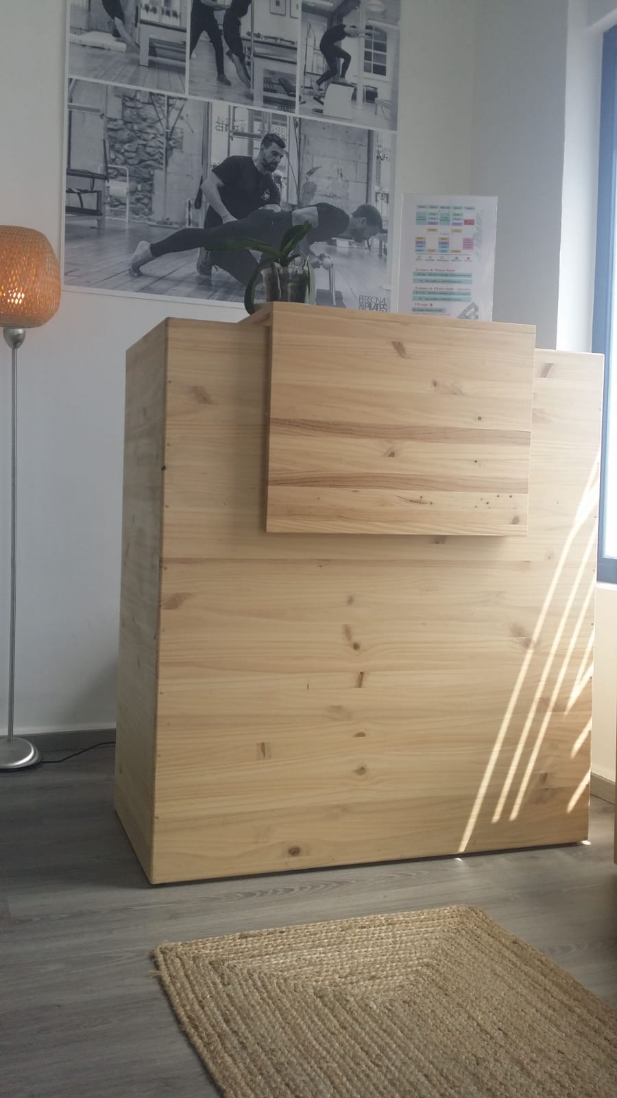 Para la sala de pilates Fluye desarrollamos un conjunto de mobiliario que combina funcionalidad, elegancia y cuidado por el detalle. El recibidor de recepción destaca por su diseño sencillo y refinado en la parte frontal, ofreciendo una primera impresión limpia y armoniosa al entrar al centro. En la parte posterior, se integra un escritorio práctico con cajones, pensado para optimizar la organización y facilitar el trabajo del personal sin sacrificar la estética.