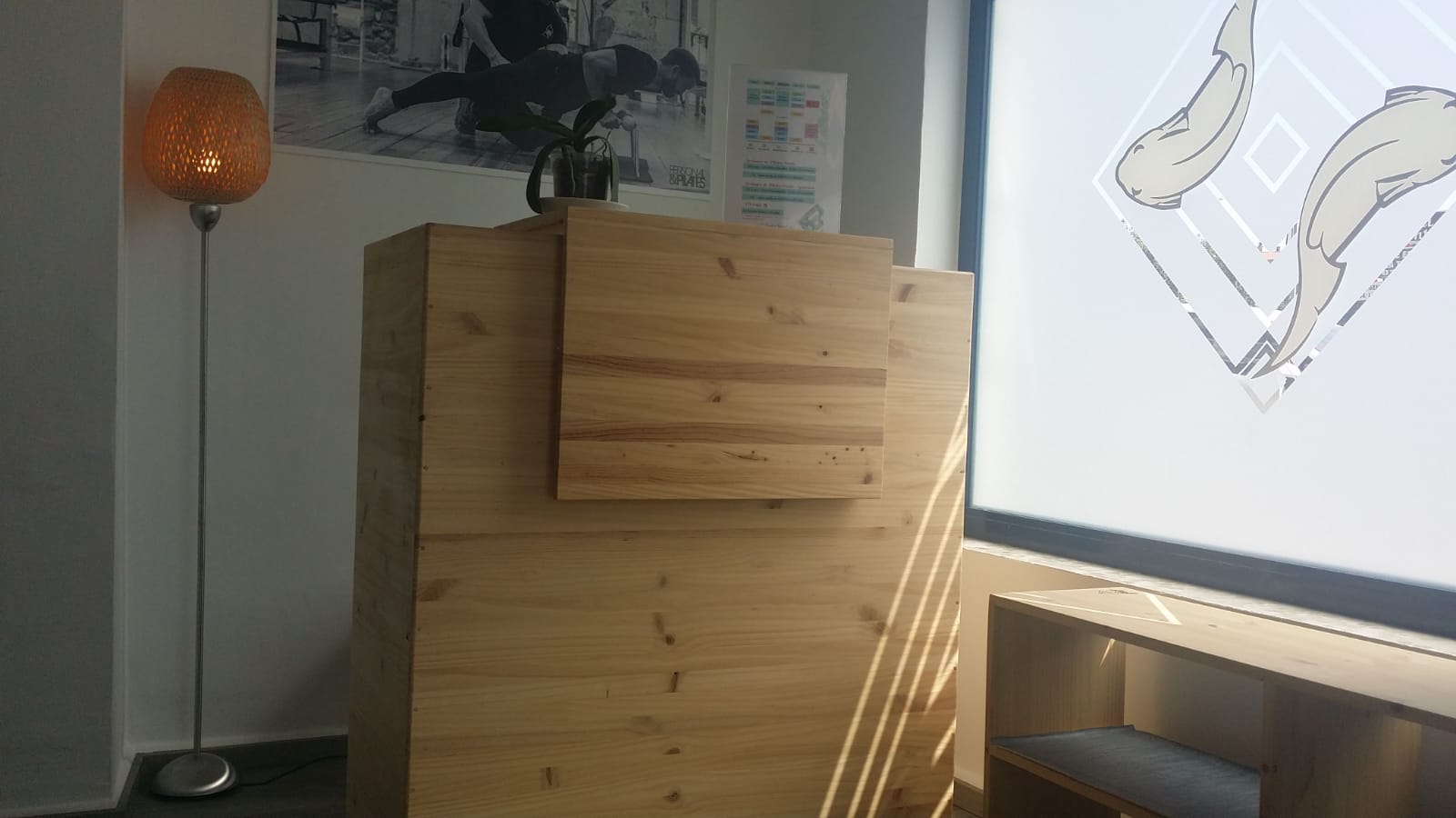 El mobiliario para la sala de pilates Fluye fue realizado en madera de pino de tono natural, cuidando cada detalle desde el diseño hasta la instalación. El proceso comenzó con la creación de un modelo en 3D, que permitió al cliente comprobar las medidas, proporciones y el diseño general antes de la fabricación.